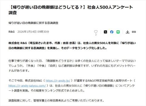 「【帰りが遅い日の晩御飯はどうしてる?】社会人500人アンケート調査」(2026年1月14日発表)